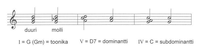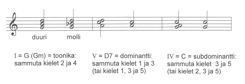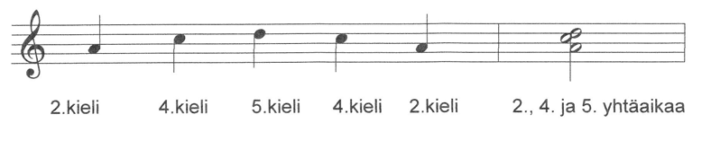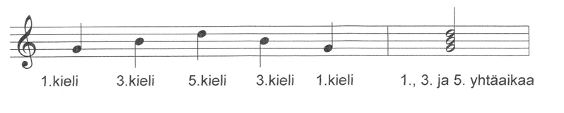 1. Viisikielistä kanteletta voi käyttää laulun taitoisen melodiasoittimen säestykseen, vaikka sointuvalikoima on suppea. Sointuja voi soittaa näppäämällä kielet soimaan: