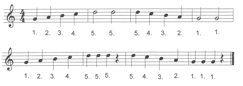 4. harjoitus: käytä kaikkia sormia. (Melodia: Satu meni saunaan)